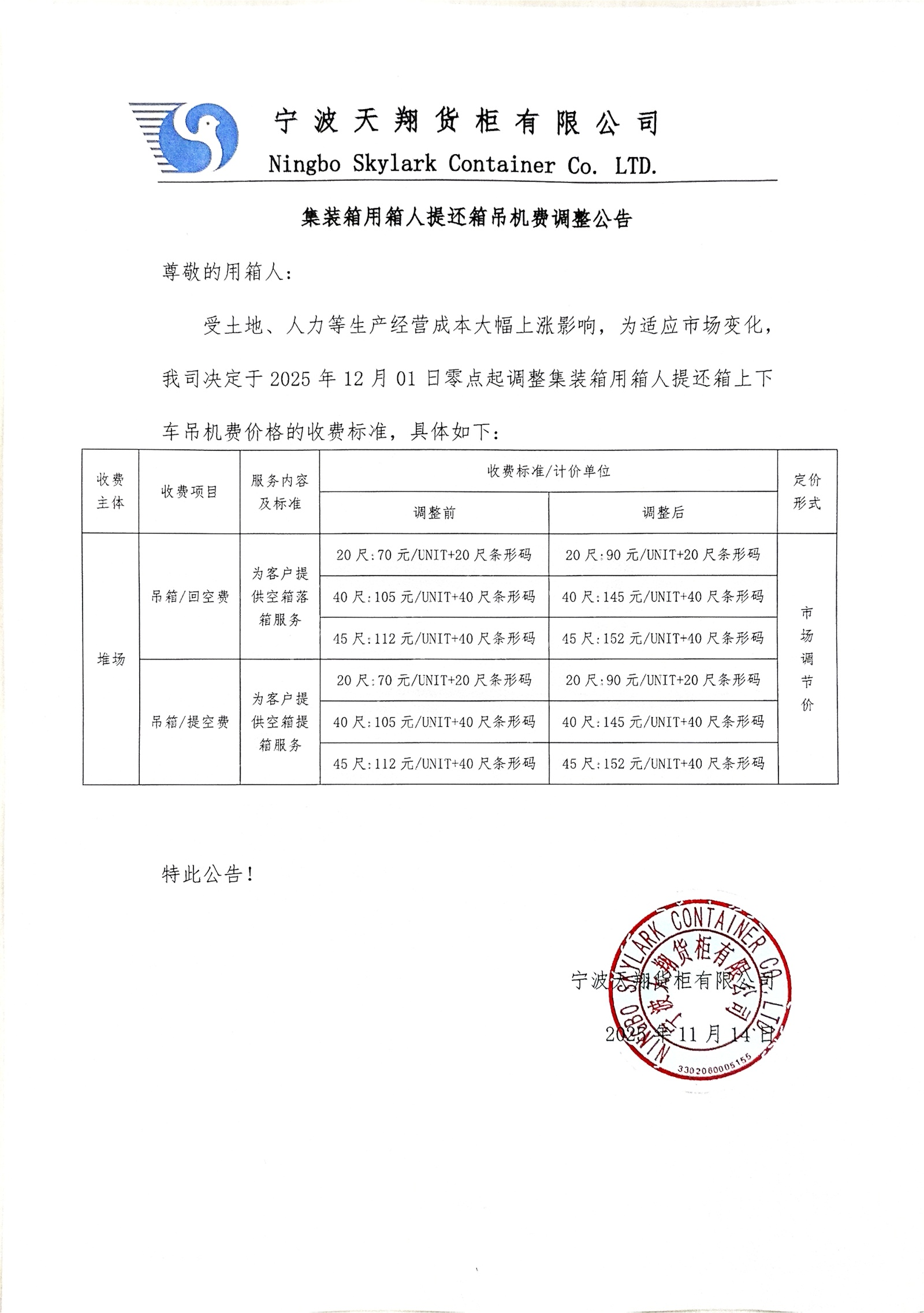 關于調(diào)整用箱人提還箱吊機費收費標準的公告