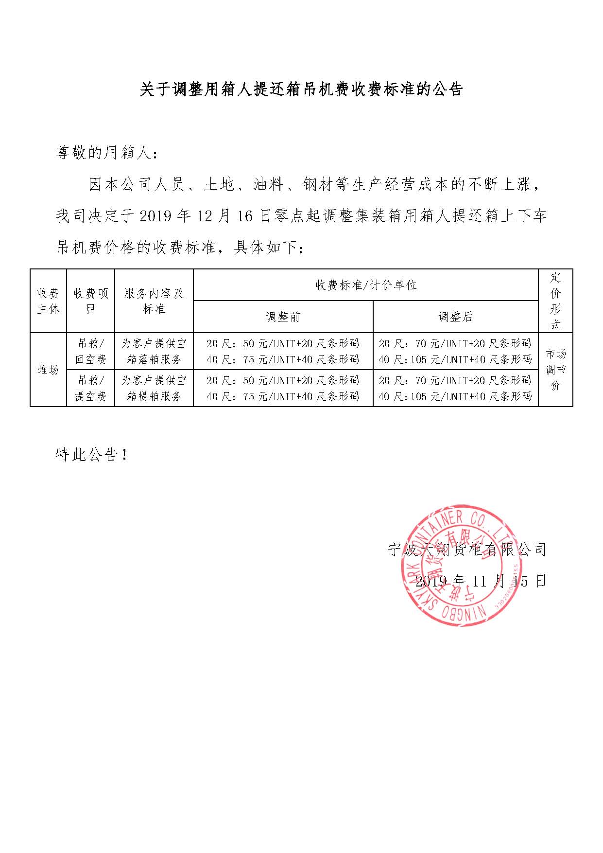 Notice on the adjustment of the charging standard of the lifting machine fee for the return of containers by the users
